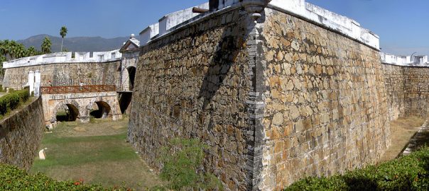 • New Spain also built a big star fort, called the Fort of San Diego, in Acapulco. WP says it was built: “to protect Acapulco from attacks by pirates, since the city was an important trading port, being the point of departure for the Manila galleons. The fort was… completed in 1617 to designs of the Dutch military engineer Adrián Boot.” (By the way, the banner image above is a recent view of one corner of the fort.)